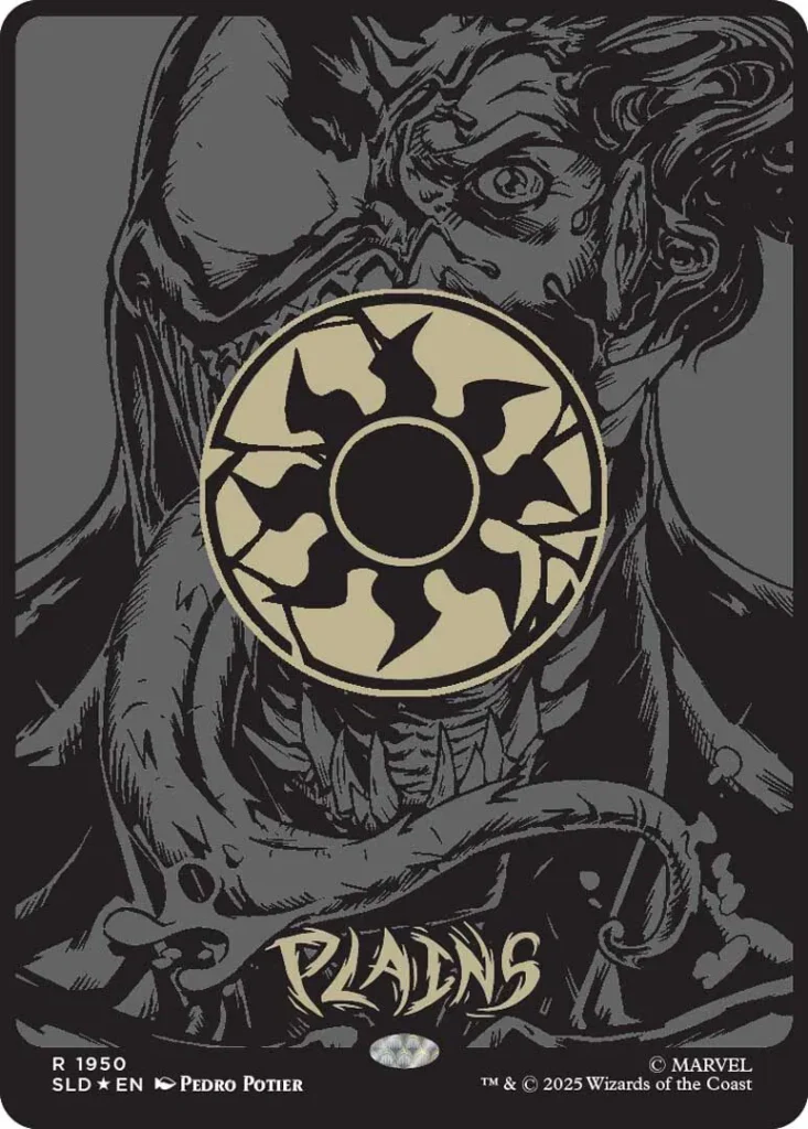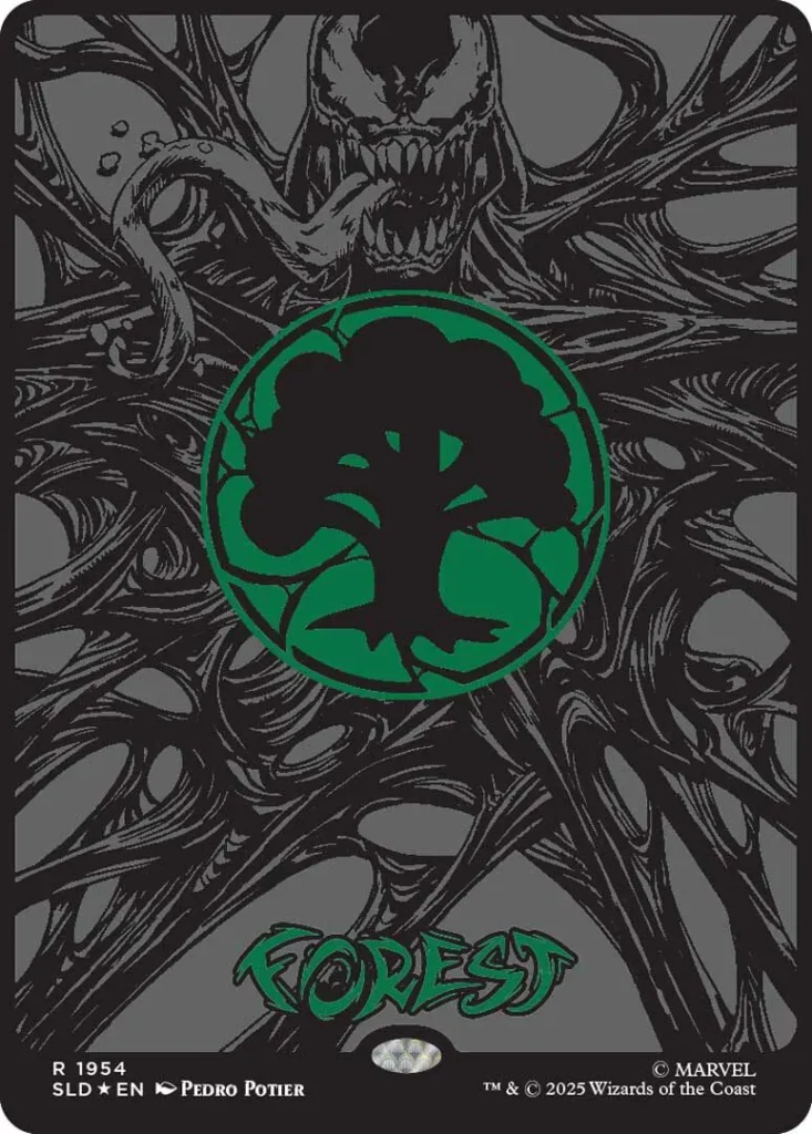 Secret Lair x Marvel’s Spider-Man: Mana Symbiote includes two of each basic shown above and is only available in the raised foiling treatment and will cost $59.99.