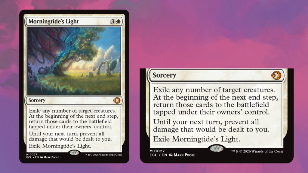 Players have clamored for a return to Lorwyn and it will finally come at the start of next year with Lorwyn Eclipsed. The set shows the world as it is torn between Lorwyn and Shadowmoor, with the cards and characters displaying versions in day/night.