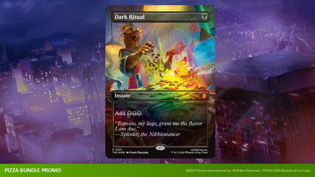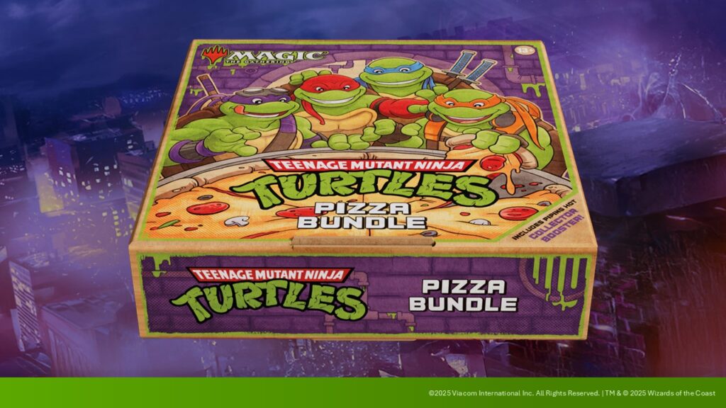 The TMNT Pizza Bundle includes “everyone’s favorite slice of the set” like Pizza Lands, Collector Boosters, and two (of six total) unique promo cards from “Magic’s Past,” each with new, pizza themed artwork.