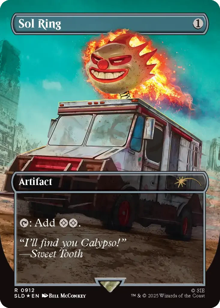 As an added bonus, you’ll get a copy of this rainbow foil Sol Ring promo featuring Twisted Metal artwork by Bill McConkey with each $199 spent on Superdrop products.
