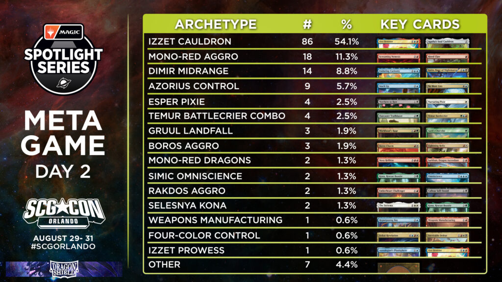 Day 2 consisted of 159 players that reached 18 match points on Day 1. See how the archetypes converted below. Along with Izzet Cauldron’s strong performance, Mono-Red Aggro players converted at more than a 50 percent clip.