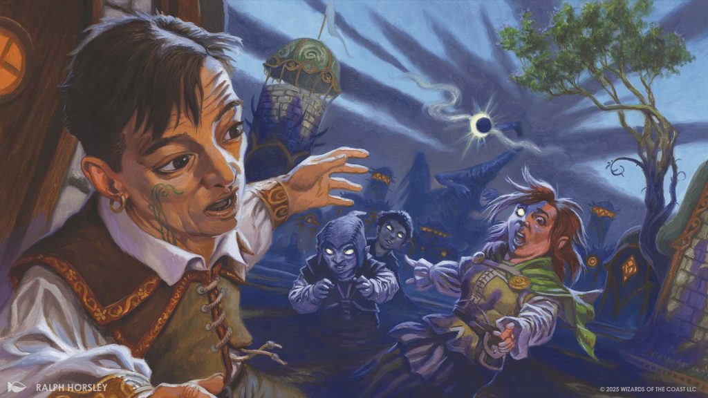 Upon being discovered, the Faerie lets out a mischievous laugh before flying out a nearby window, then, as if sounding the creature’s departure, the town’s warning siren echos through the hall. Rushing to the window, the group looks out to find Isilu marching into the town, bringing the darkness of Shadowmoor with it.