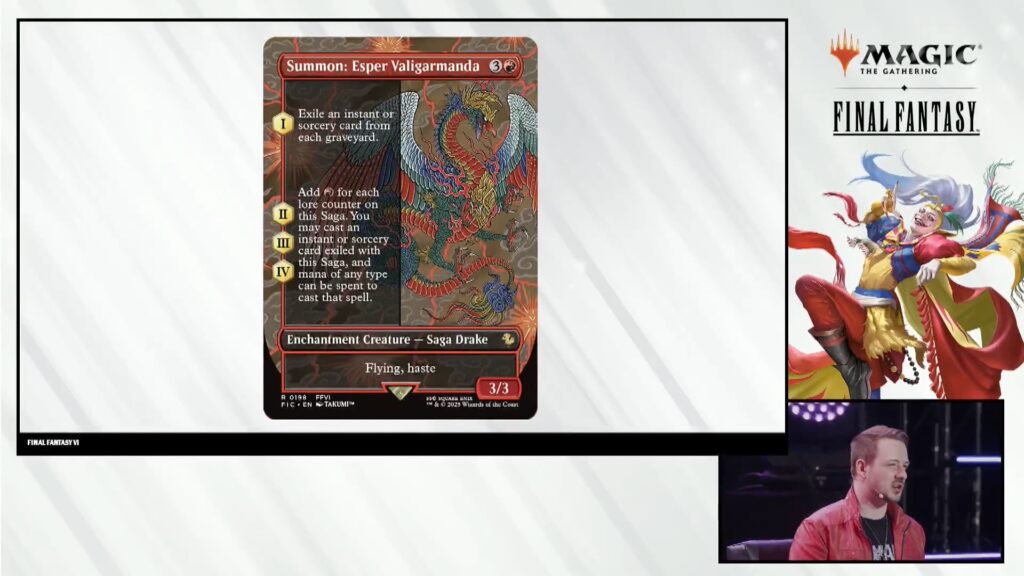 VI also introduces summons, creatures that fight for the player for a limited time. Magic: The Gathering expresses these as Sagas, a type of enchantment with a series of effects over a certain number of turns, as seen on Summon: Esper Valigarmanda.