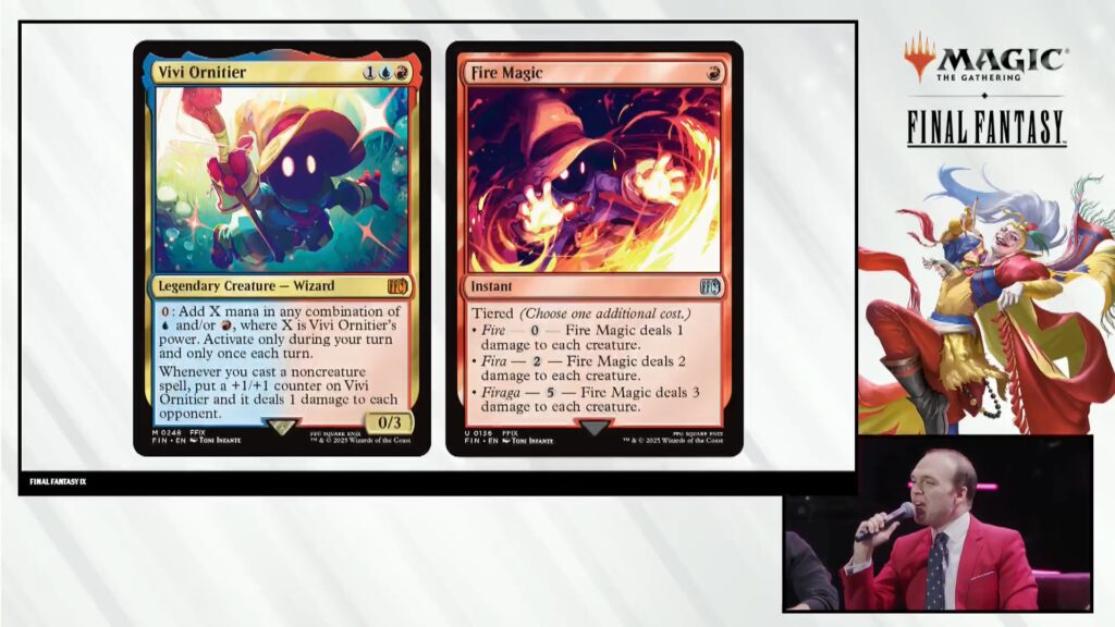 Vivi Ornitier’s abilities encourage casting noncreature spells, such as Fire Magic. Fire Magic has the new Tiered ability, which lets players spend different amounts of mana to emulate different tiers of spells, such as Fire, Fira, and Firaga.