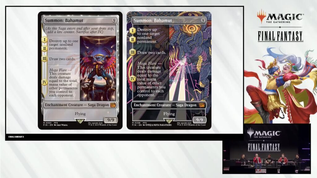 In the main set, Yuna, Hope of Spira has mechanics geared toward using the various Summon enchantment creatures across the set, including Summon: Bahamut.