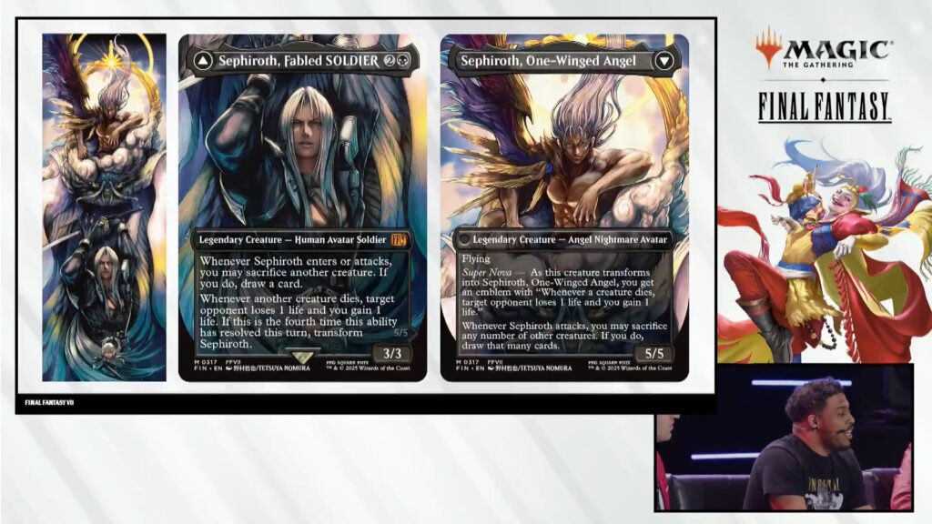 Iconic villain Sephiroth appears as a double-faced card, Sephiroth, Fabled SOLDIER // Sephiroth, One-Winged Angel.