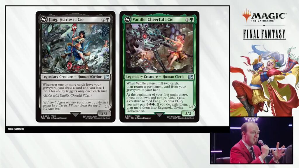 Fang, Fearless l’Cie and Vanille, Cheerful l’Cie share a meld ability, unique in the set. Meet the conditions, and you can meld the two cards, turning them over to make Ragnarok, Divine Deliverance.
