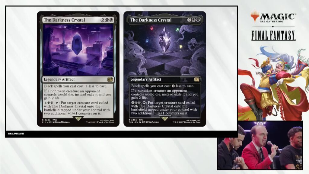 The Final Fantasy III cards kick off with Crystals, an iconic aspect of the series. The Darkness Crystal, a legendary artifact, is one card in a cycle.
