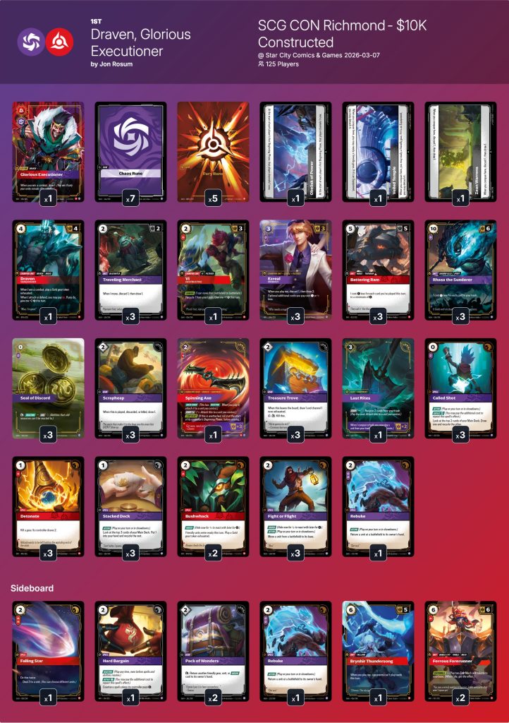 Jon Rosum won Saturday’s Riftbound $10K with Draven, Glorious Executioner.