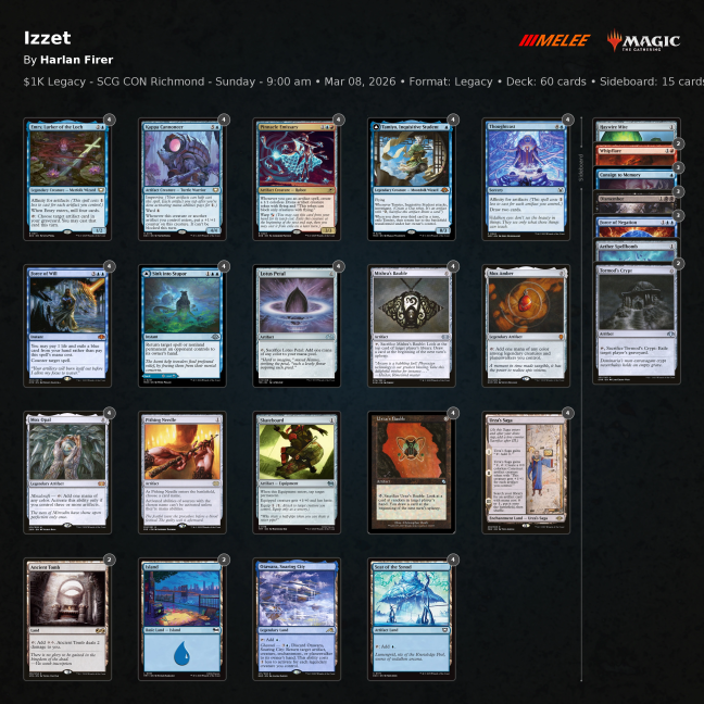 Harlan Firer won the Legacy $1K on Sunday with Izzet Affinity.